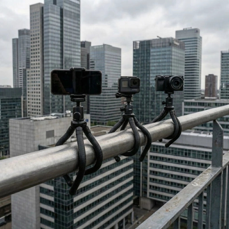 Le trépied flexible permet une fixation sur des surfaces irrégulières : barre, rambarde, branche ou mobilier.